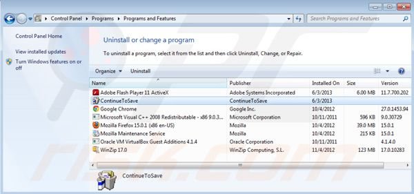 In the uninstall programs window, look for "ContinueToSave", select this entry and click "Uninstall" or "Remove".
