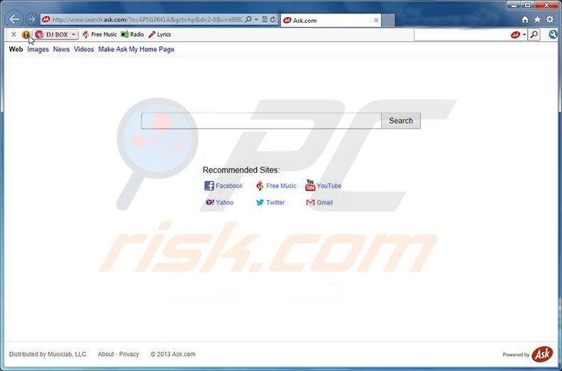 After successful installation, Music Toolbar assigns the Internet browser (Internet Explorer, Google Chrome, and Mozilla Firefox) homepage and default search engine settings to search.ask.com Furthermore by installing this toolbar, users agree for the software to track their Internet browsing activity by recording IP addresses, search queries, ads clicked, and other information.