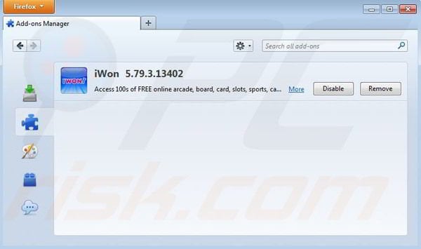 (at the top right corner of the main window) select "Add-ons". Click on "Extensions" and remove "iWon".