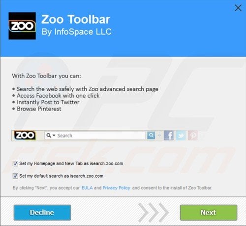 The Zoo Toolbar browser add-on was created by InfoSpace LLC. This browser hijacker infiltrates Internet browsers (Internet Explorer, Google Chrome, and Mozilla Firefox) using a deceptive software marketing method called 'bundling'. Commonly, Internet users install isearch.zoo.com adware without their consent when downloading or installing free software.