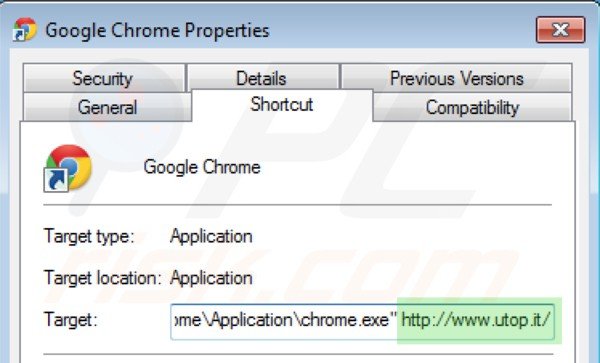 This browser hijacker modifies the "Target" field of the Google Chrome shortcut. To fix this, locate the Google Chrome shortcut on your Desktop and click the right mouse button over it. In the opened menu choose "Properties". In the opened window locate the Target field and eliminate all text (hxxp://www.utop.it/...), which is entered after "C:\Program Files\Google\Chrome\Application\chrome.exe"