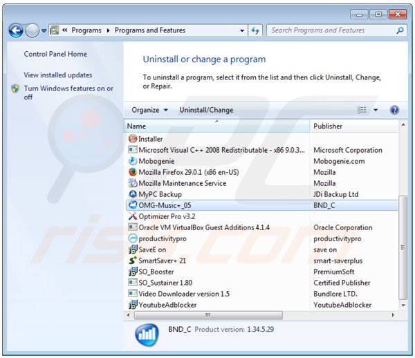 In the uninstall programs window: look for "OMG-Music+_05", select this entry and click "Uninstall" or "Remove".