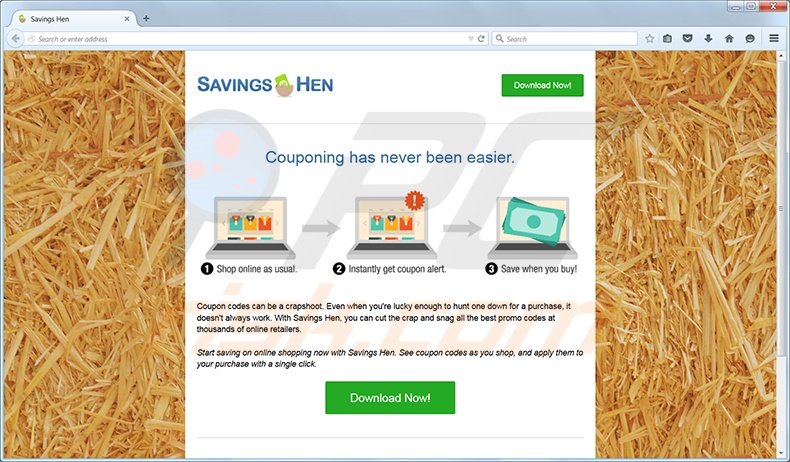 Developers of this browser plug-in use a deceptive software marketing method called 'bundling', thus, many users install this browser add-on inadvertently without their consent. After successful infiltration, Savings Hen generates intrusive online advertisements by converting words on pages viewed into hyperlinks that link to advertisements.