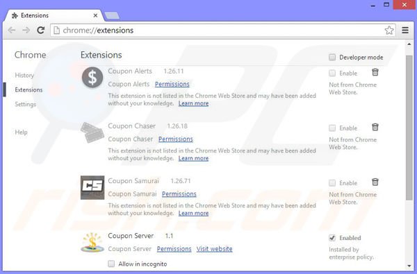 Remove malicious extensions from Google Chrome: