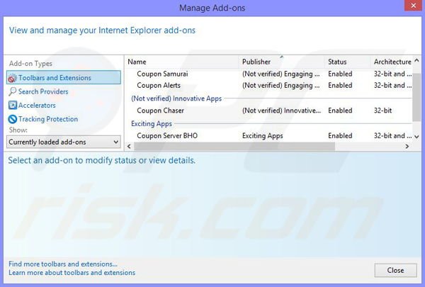 (at the top right corner of Internet Explorer), select "Manage Add-ons". Look for "RopeInSavings", select this entry and click "Remove".