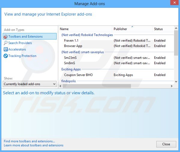 (at the top right corner of Internet Explorer), select "Manage Add-ons". Look for recently-installed potentially unwanted plug-ins, select them and click "Remove".