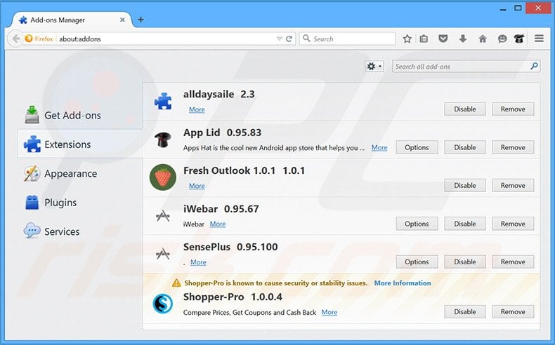 In the opened window click Extensions, locate any recently installed suspicious extension, select it and click Uninstall.