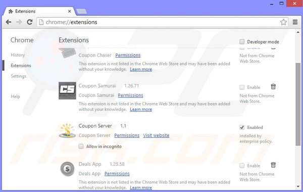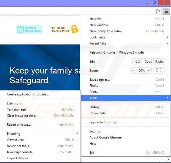 (at the top right corner of Google Chrome), select "Tools" and click on "Extensions". Locate: "Browsing Safeguard", select this entry and click the trash can icon. Note that Browsing Safeguard ads can be caused by other adware. In the "extensions" window of Google Chrome, remove all suspicious browser extensions.