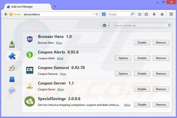 (at the top right corner of the main window), select "Add-ons". Click on "Extensions", in the opened window remove "Browser Secure". Note that Browser Secure ads can be generated by other adware. In the "Add-ons Manager" window, remove all suspicious browser add-ons.