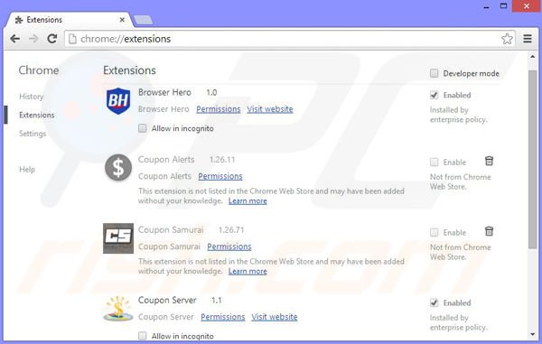 Remove malicious extensions from Google Chrome: