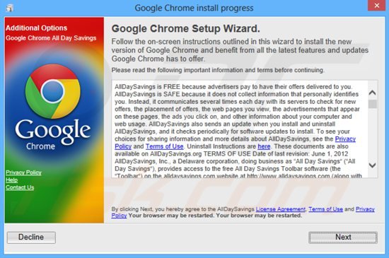 This may seem legitimate and useful functionality, however, be aware that All Day Savings is categorized as adware or a potentially unwanted program (PUP) since it employs a deceptive software marketing method called 'bundling' to install on Internet browsers (Internet Explorer, Mozilla Firefox, and Google Chrome).