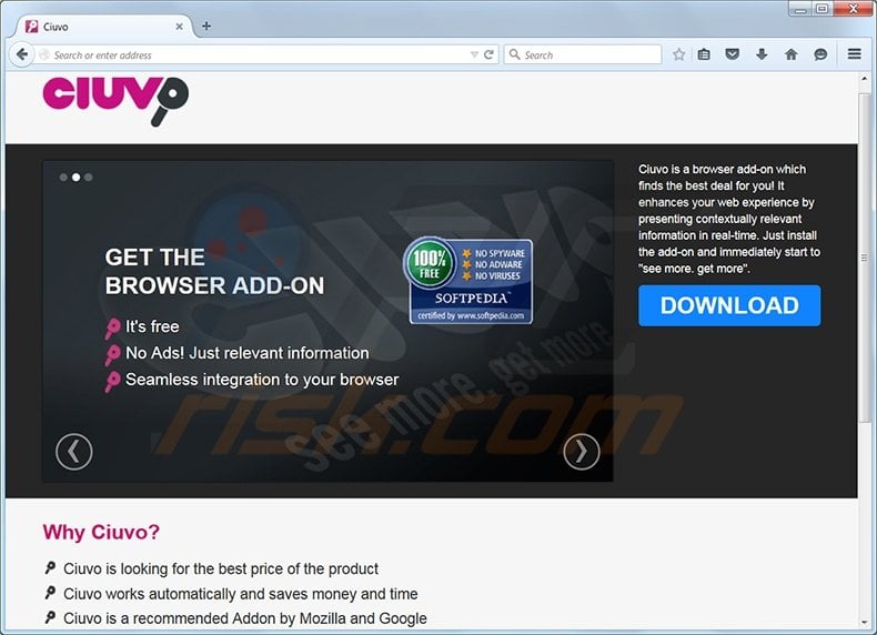 The Ciuvo add-on is compatible with Internet Explorer, Mozilla Firefox, and Google Chrome. It claims to save time and money by displaying special deals/discounts and coupons when browsing online shopping websites. Although Ciuvo may seem to be a legitimate and useful browser extension, be aware that this application is often referred to as a virus or malware.