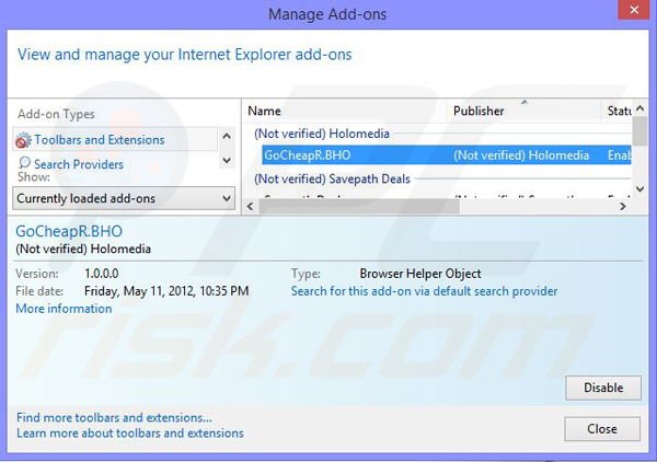 (at the top right corner of Internet Explorer), select "Manage Add-ons". Look for "GoCheapR.BHO", select this entry and click "Remove". Note that GoCheapR ads can be caused by other adware. In the Manage Add-ons window, remove all suspicious browser add-ons.