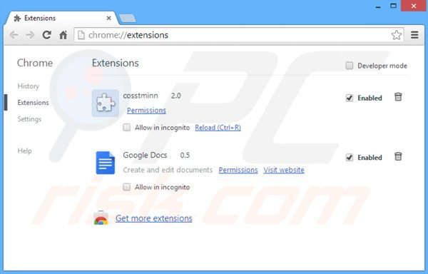 Remove malicious extensions from Google Chrome: