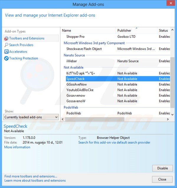 (at the top right corner of Internet Explorer), select "Manage Add-ons". Look for "SpeedCheck", select this entry and click "Remove".