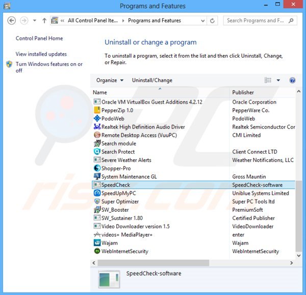 In the uninstall programs window, look for "SpeedCheck", select this entry and click "Uninstall" or "Remove".