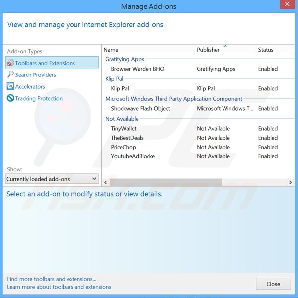 (at the top right corner of Internet Explorer), select "Manage Add-ons". Look for any recently-installed suspicious browser extensions, select these entries and click "Remove".