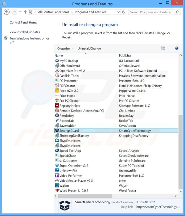 In the uninstall programs window: look for “SettigsGuard”, select this entry and click "Uninstall" or "Remove".