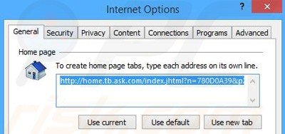 (at the top right corner of Internet Explorer), select "Internet Options", in the opened window, remove hxxp://home.tb.ask.com and enter your preferred domain, which will open each time you launch Internet Explorer. You can also enter about: blank to open a blank page when you start Internet Explorer.