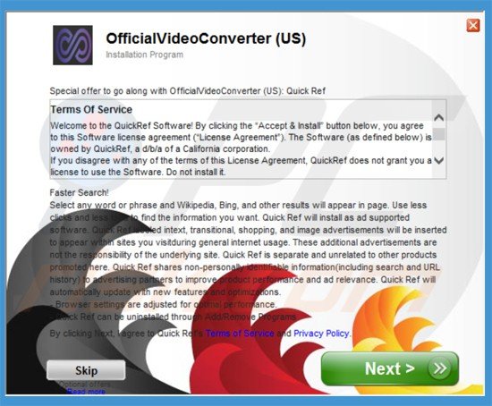 To avoid installation of QuickRef, or other adware, follow each step of the freeware download procedure, click 'Decline' and uncheck all additional applications.