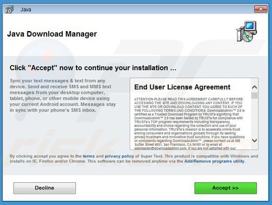 Created by DownloadAdmin, the SuperText application claims to allow users to send mobile messages directly from a desktop computer, tablet, or other mobile device. On initial inspection, this functionality may seem legitimate and useful, however, SuperText is categorized as adware or a potentially unwanted program (PUP).
