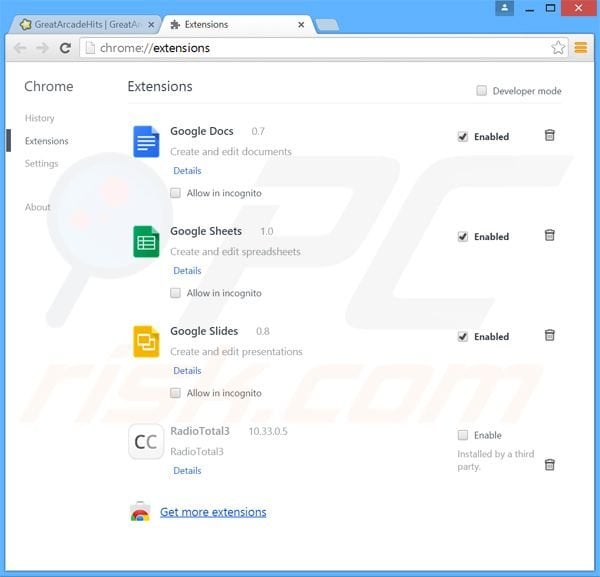 (at the top right corner of Google Chrome), select "Tools" and click "Extensions". Locate "GreatArcadeHits", select this entry and click the trash can icon.