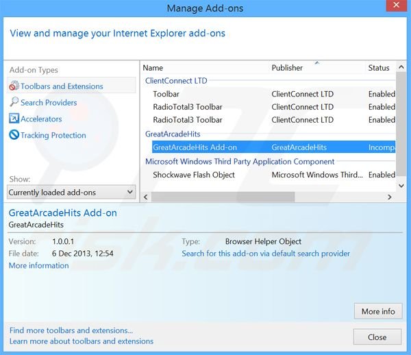 (at the top right corner of Internet Explorer), select "Manage Add-ons". Look for "GreatArcadeHits Add-on", select this entry and click "Remove".