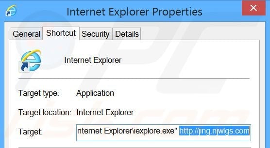 This browser hijacker changes the "Target" field of the Internet Explorer shortcut. To fix this, locate the shortcut on your Desktop and click the right mouse button over it. In the opened menu, choose "Properties". In the opened window, locate the Target field and eliminate text (hxxp://jing.njwlgs.com/...), which is entered after "C:\Program Files\Internet Explorer \iexplore.exe".