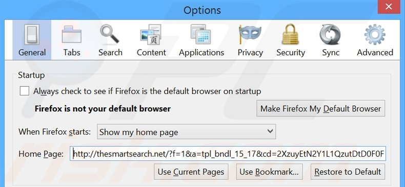 (at the top right corner of the main window), then select "Options", in the opened window, remove hxxp://thesmartsearch.net and enter your preferred domain, which will open each time you start Mozilla Firefox.