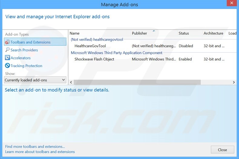 (at the top right corner of Internet Explorer), select "Manage Add-ons". Look for any recently-installed suspicious browser extensions, select these entries and click "Remove".