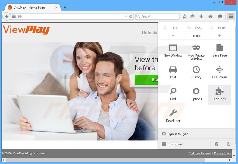 (at the top right corner of the main window), select "Add-ons". Click "Extensions", in the opened window, remove "ViewPlay".