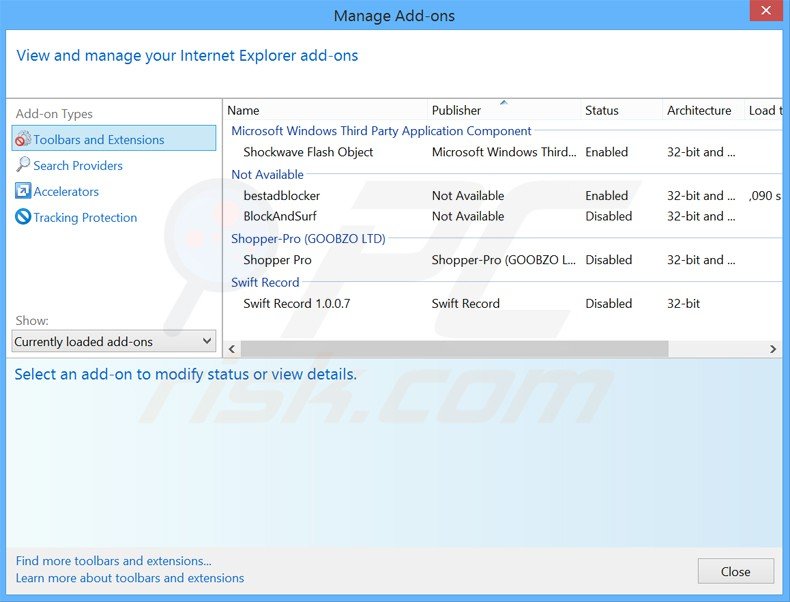 (at the top right corner of Internet Explorer), select "Manage Add-ons". Look for any recently-installed browser extensions, select these entries and click "Remove".
