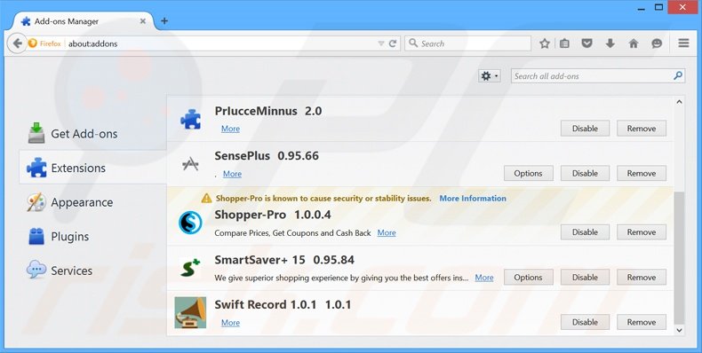 In the opened window click Extensions, locate any recently installed suspicious extension, select it and click Uninstall.