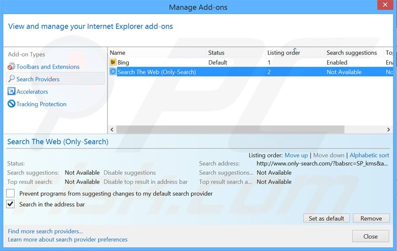 (at the top right corner of Internet Explorer), select "Manage Add-ons". In the opened window, select "Search Providers", set "Google", "Bing", or any other preferred search engine as your default and then remove "Search The Web".