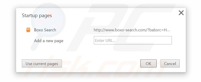 (at the top right corner of Google Chrome), select "Settings". In the "On startup" section, click "set pages", hover your mouse over hxxp://boxo-search.com and click the x symbol. Now, you can add your preferred website as your homepage.