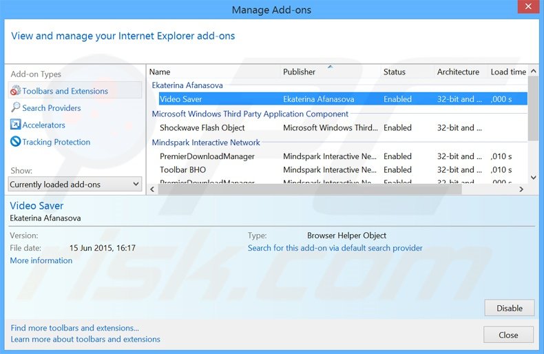 (at the top right corner of Internet Explorer), select "Manage Add-ons". Look for "Video Saver", and other recently-installed extensions, select these entries and click "Remove".