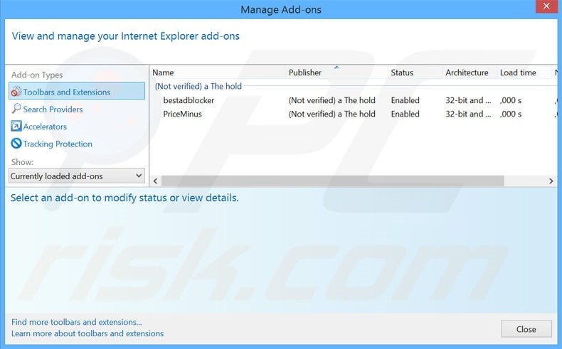 (at the top right corner of Internet Explorer), select "Manage Add-ons". Look for any recently-installed suspicious browser extensions, select these entries and click "Remove".