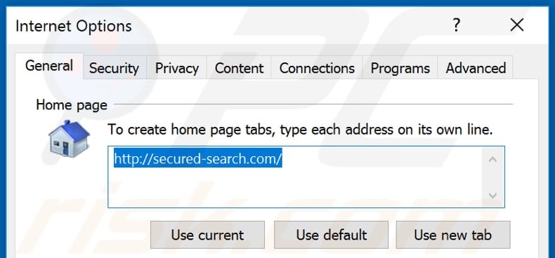 (at the top right corner of Internet Explorer), select "Internet Options", in the opened window remove hxxp://secured-search.com and enter your preferred domain, which will open each time you launch Internet Explorer. You can also enter about: blank to open a blank page when you start Internet Explorer.