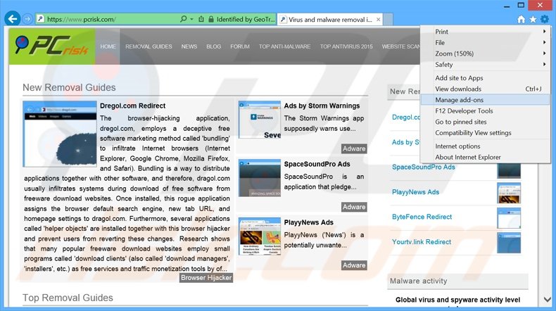 (at the top right corner of Internet Explorer), select "Manage Add-ons". Look for any recently-installed suspicious browser extensions, select these entries and click "Remove".
