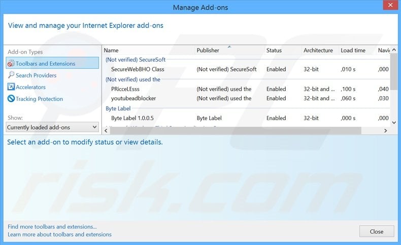(at the top right corner of Internet Explorer), select "Manage Add-ons". Look for any recently-installed suspicious browser extensions, select these entries and click "Remove".