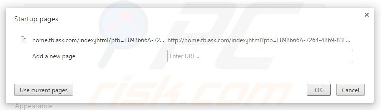 (at the top right corner of Google Chrome), select "Settings". In the "On startup" section, click "set pages", hover your mouse over hxxp://home.tb.ask.com and click the x symbol. Now, you can add your preferred website as your homepage.