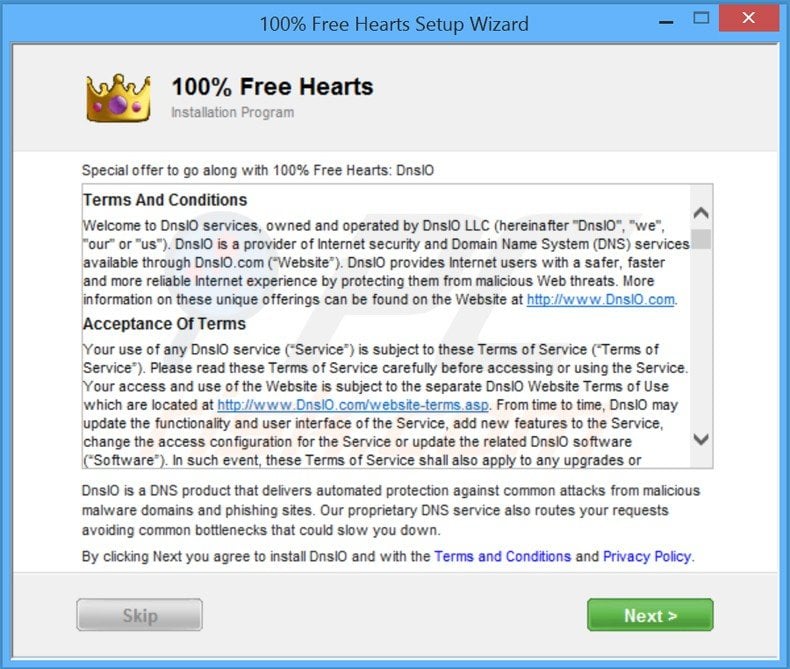 Although DNSIO has an official download website, it is likely to be distributed as a 'bundle' with other (usually free) software. Bundled applications are often concealed within the 'Custom' or 'Advanced' settings, and since many users do not pay enough attention when downloading and installing software, this distribution method is very effective.