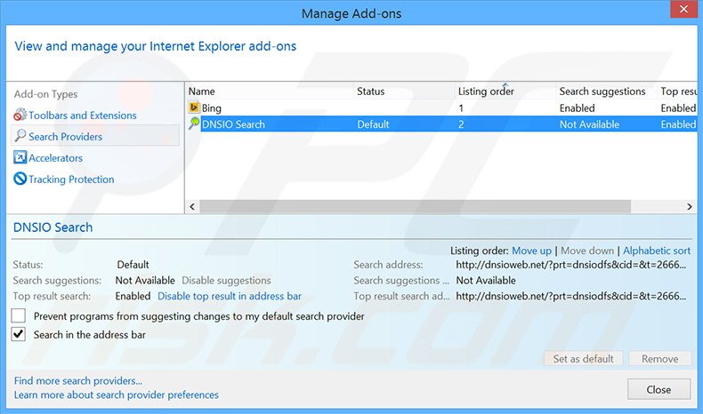 (at the top right corner of Internet Explorer), select "Manage Add-ons". In the opened window, select "Search Providers", set "Google", "Bing", or any other preferred search engine as your default and then remove "DNSIO Search".