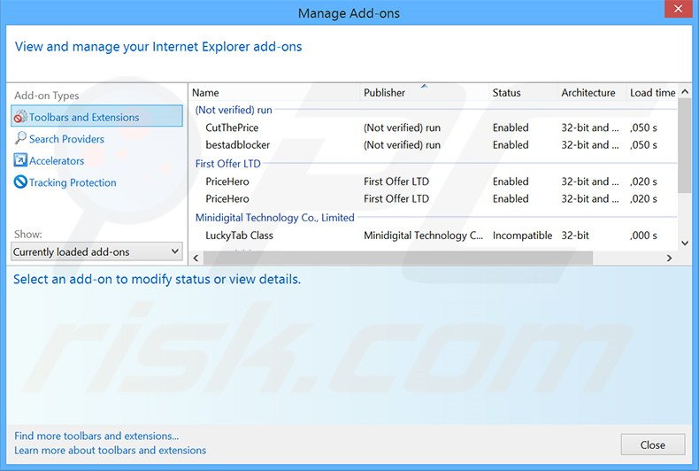 (at the top right corner of Internet Explorer), select "Manage Add-ons". Look for any recently-installed suspicious browser extensions, select these entries and click "Remove".
