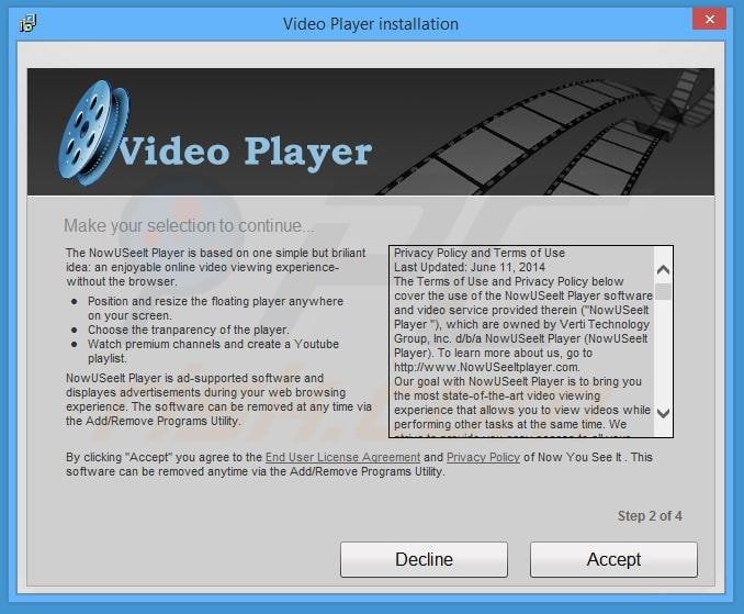 Deceptive free software installers used in NowUSeeIt Player adware distribution: