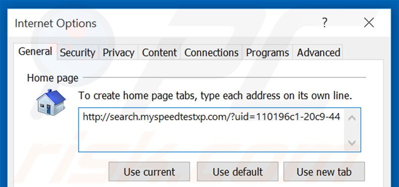 (at the top right corner of Internet Explorer), select "Internet Options", in the opened window, remove hxxp://search.myspeedtestxp.com and enter your preferred domain, which will open each time you launch Internet Explorer. You can also enter about: blank to open a blank page when you start Internet Explorer.
