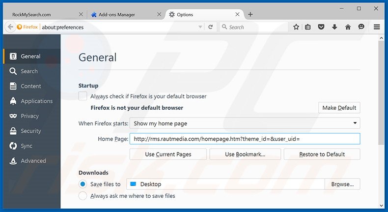 (at the top right corner of the main window), then select "Options", in the opened window, remove hxxp://rms.rautmedia.com and enter your preferred domain, which will open each time you start Mozilla Firefox.