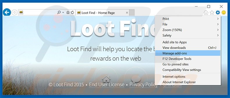 (at the top right corner of Internet Explorer), select "Manage Add-ons". Look for "Loot Find", select this entry and click "Remove".
