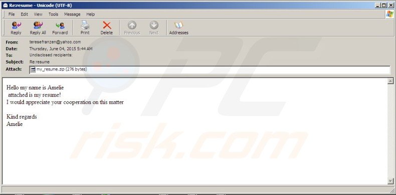 Be aware that HELP_YOUR_FILES is distributed using malicious email messages with bogus attachments - zipped files supposedly containing resumes, shipping information, etc, The attachments are JavaScript files that (when executed) download other infectious executable files, storing them in a Windows %Temp% folder and then running them.