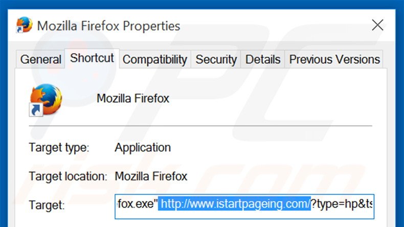 This browser hijacker changes the "Target" field of the Mozilla Firefox shortcut. To fix this, locate the shortcut on your Desktop and click the right mouse button over it. In the opened menu, choose "Properties". In the opened window, locate the Target field and eliminate all text (hxxp://www.istartpageing.com/...), which is entered after "C:\Program Files\Mozilla Firefox\firefox.exe"